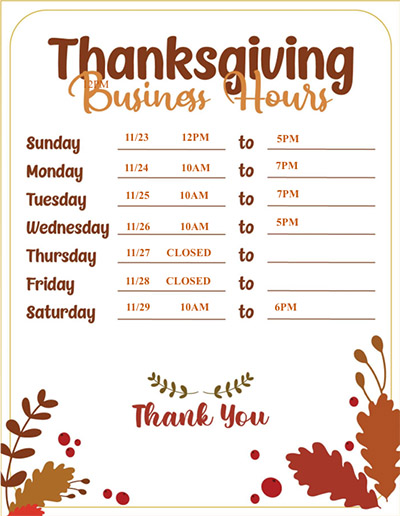 Get Started!Mon: Closed Tue: 10:00 AM - 7:00 PM Wed 10:00 AM - 7:00 PM Thu 10:00 AM - 7:00 PM Fri 10:00 AM - 7:00 PM Sat 10:00 AM - 6:00 PM Sun 11:45 AM - 5:00 PM Booking online only available up to: 06:30 PM (On weekday) 04:30 PM (On Sat - Sun)
